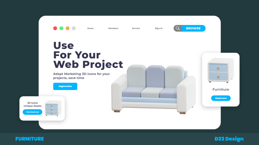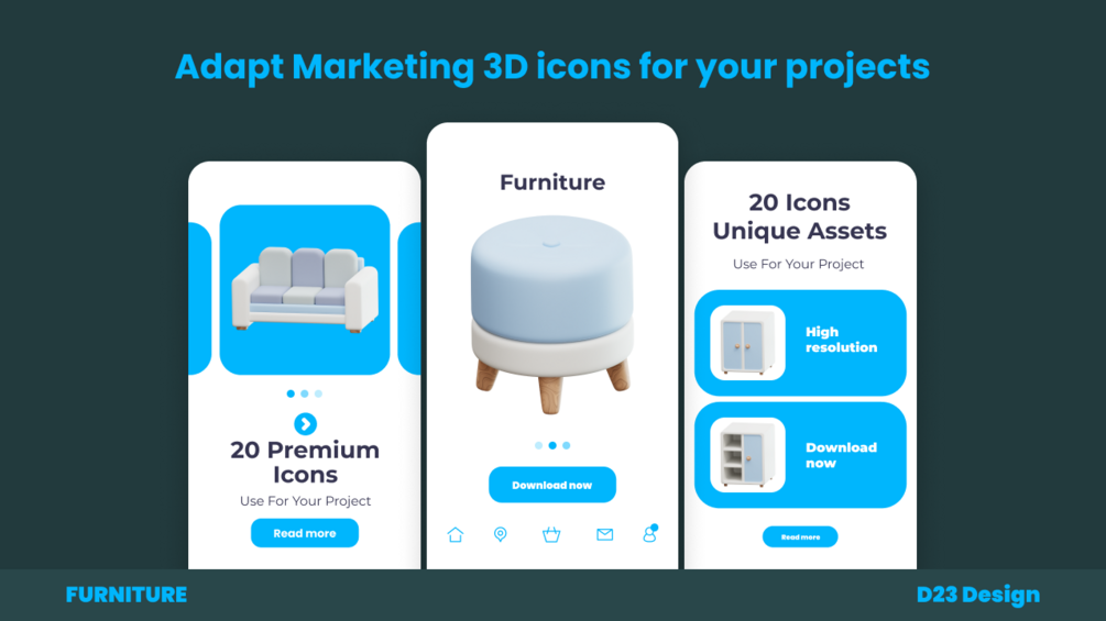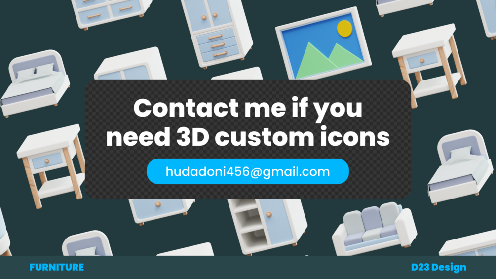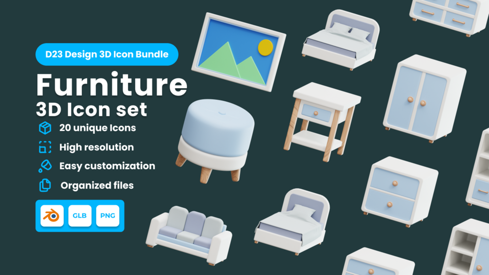 Enhance your designs with this collection of 20 high-quality 3D furniture icons, absolutely free! Perfect for web design, app development, presentations, and more.